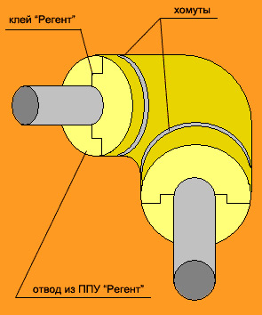 Крепить отводы в ППУ изоляции следует не менее чем 2 хомутами и клеем «Регент» Выполнение этих простых правил позволит обеспечить эффективную работу теплоизоляции трубопровода в любых климатических условиях.